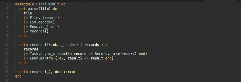 The happy path starts at ‘with’ and the value before the ‘<-’ arrow is the expected result, anything that does not match this value will fall into the ‘else’ clause and all values with an underscore prefix are ignored, thus anything not matching will return a ‘0’. Happy paths are awesome!