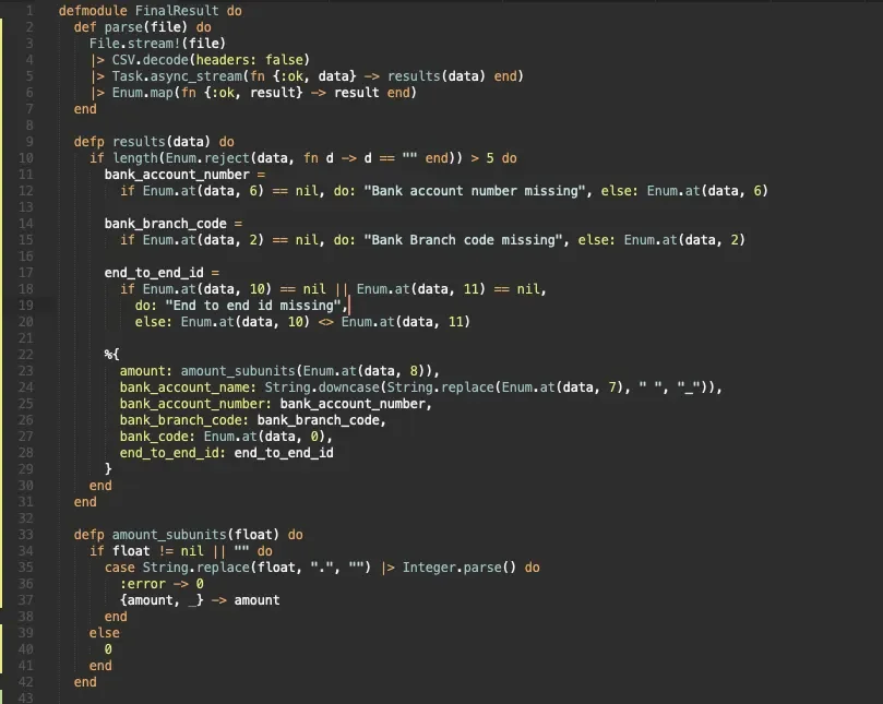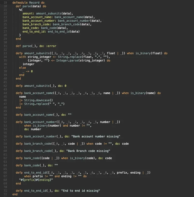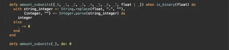 For those not familiar with Elixir pattern matching and guards, the first argument is pattern matching the 8th element in a list. The ‘when is_binary(float)’ is a guard that matches when the field is a string.