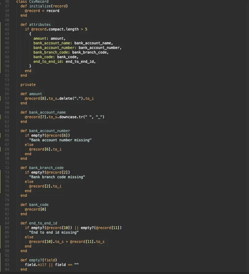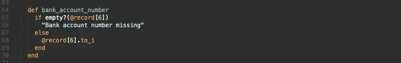 There were certain methods and scenarios in Ruby that were really hard to find a way around not using an ‘if’ and yet maintain readability. Obviously we could use a ‘case’ statement, but that is semantics and does not really help us comply with the ‘tell don’t ask’ goal we are trying to achieve here. For example the ‘bank_account_number’ method.